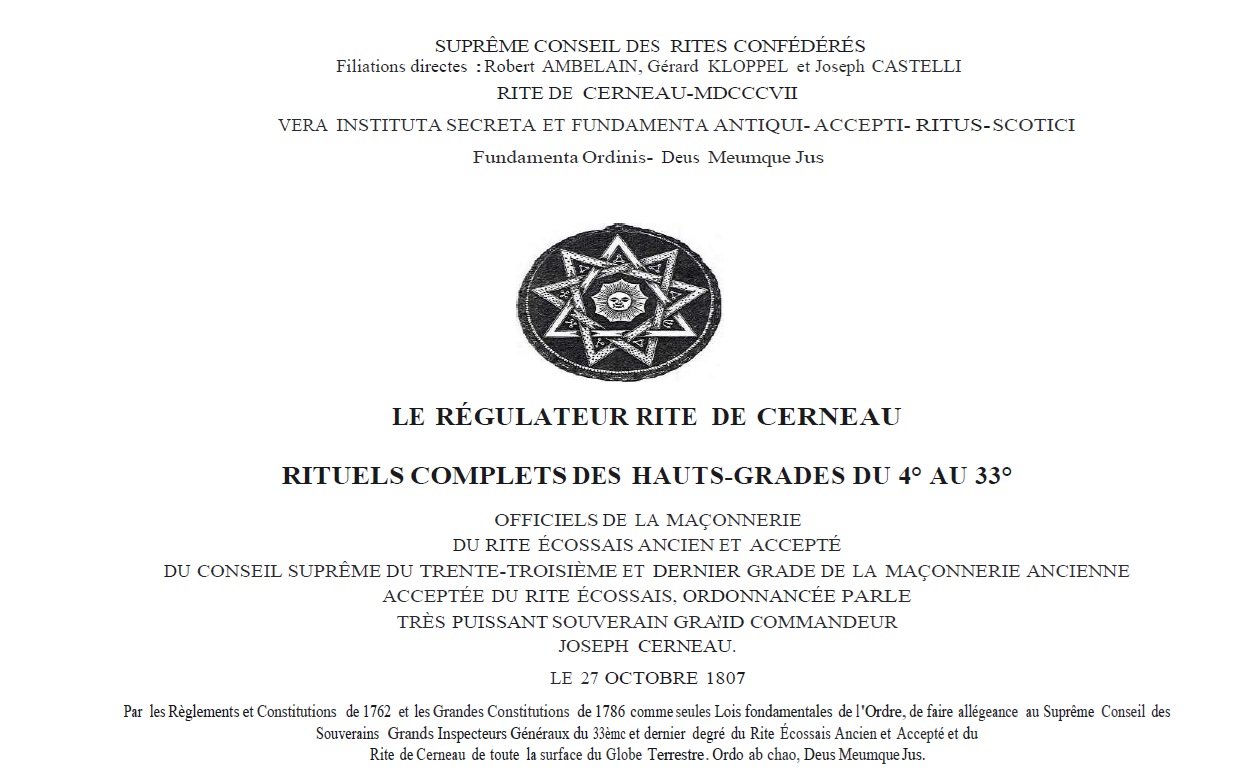 Il Supremo Consiglio Nazionale del Rito di Cerneau ( R.S.A.A.) è l’unico presente sul nostro territorio Nazionale a seguito di patente rilasciata dal “Supréme Conseil des Rites Confédérés” allo Zenith di Parigi, in data 5 settembre 2015 E.V. al Sovrano Santuario di Sardegna di Memphis e Misraim.