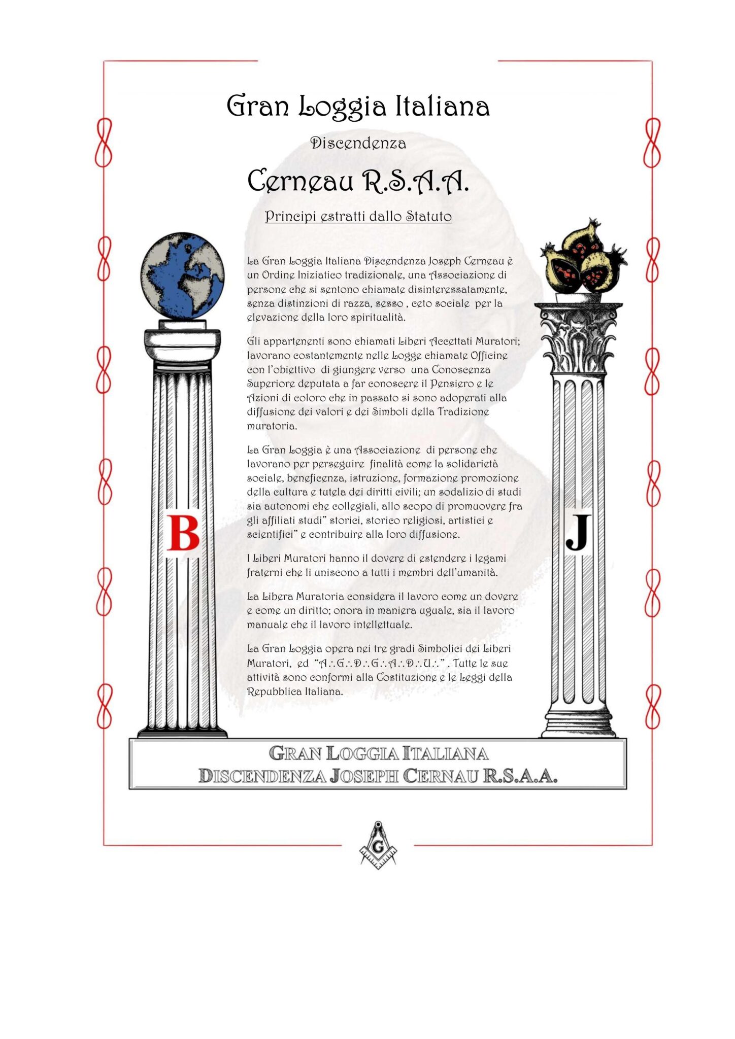 In Data 17 settembre 2023, allo Zenit di Roma, tre Logge costituenti : la R.L. Joseph Cerneau, la R.L. Giordano Bruno-Vittorio Spada e la R.L. Giovanni Ghinazzi , tutte all’Oriente di Roma, innalzano le colonne della “GRAN LOGGIA ITALIANA- DISCENDENZA CERNEAU (R.S.A.A)”.; eleggendo a maggioranza assoluta il Pot.mo Fr.∙. Carlo Corlianò 3° 33° – Gran Maestro dell’Ordine.